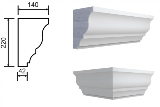 Можно выделить две основные категории подкровельных карнизов: с квадратным сечением, где обе монтажные плоскости примерно равны по ширине, и с прямоугольным сечением, где одна сторона шире другой. Использование квадратного сечения помогает создать плавный переход между линией стены и крыши, тогда как прямоугольное сечение позволяет акцентировать внимание либо на стене, либо на кровле, в зависимости от того, какая из плоскостей шире, придавая зданию интересный визуальный акцент.