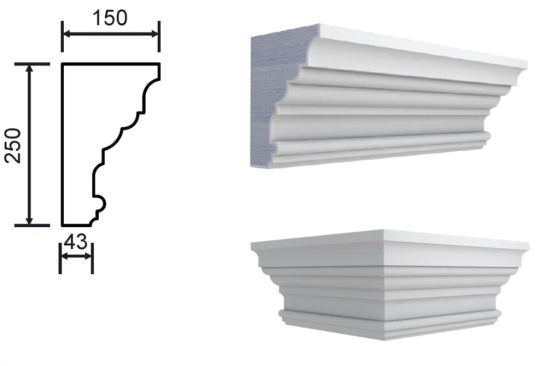 Можно выделить две основные категории подкровельных карнизов: с квадратным сечением, где обе монтажные плоскости примерно равны по ширине, и с прямоугольным сечением, где одна сторона шире другой. Использование квадратного сечения помогает создать плавный переход между линией стены и крыши, тогда как прямоугольное сечение позволяет акцентировать внимание либо на стене, либо на кровле, в зависимости от того, какая из плоскостей шире, придавая зданию интересный визуальный акцент.