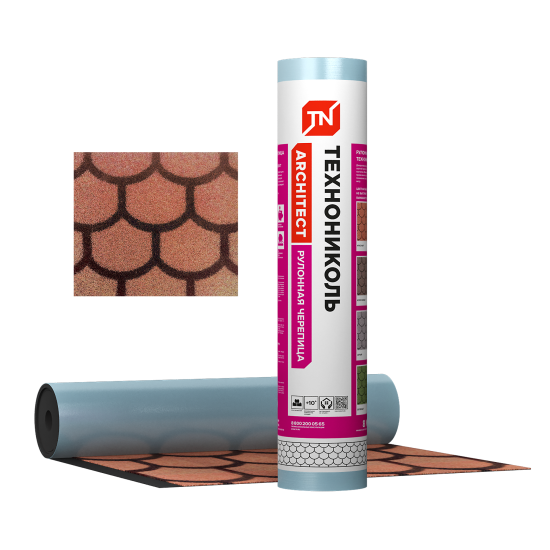 Декоративный рулонный кровельный самоклеящийся битумно-полимерный материал. Рулонную черепицу ТЕХНОНИКОЛЬ получают путем пропитки прочной полиэфирной основы битумно-полимерным вяжущим, с последующим нанесением на нижнюю сторону полотна самоклеящегося слоя. В качестве защитных покрытий применяют с лицевой стороны цветную крупнозернистую посыпку - базальт в виде декоративного рисунка, с нижней стороны полотна антиадгезионную полимерную пленку.