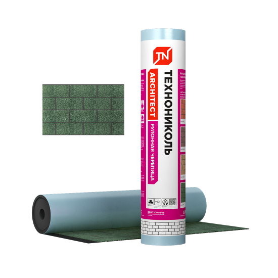 Декоративный рулонный кровельный самоклеящийся битумно-полимерный материал. Рулонную черепицу ТЕХНОНИКОЛЬ получают путем пропитки прочной полиэфирной основы битумно-полимерным вяжущим, с последующим нанесением на нижнюю сторону полотна самоклеящегося слоя. В качестве защитных покрытий применяют с лицевой стороны цветную крупнозернистую посыпку - базальт в виде декоративного рисунка, с нижней стороны полотна антиадгезионную полимерную пленку.