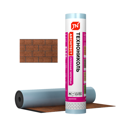Декоративный рулонный кровельный самоклеящийся битумно-полимерный материал. Рулонную черепицу ТЕХНОНИКОЛЬ получают путем пропитки прочной полиэфирной основы битумно-полимерным вяжущим, с последующим нанесением на нижнюю сторону полотна самоклеящегося слоя. В качестве защитных покрытий применяют с лицевой стороны цветную крупнозернистую посыпку - базальт в виде декоративного рисунка, с нижней стороны полотна антиадгезионную полимерную пленку.