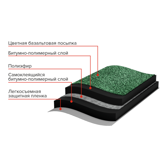 Декоративный рулонный кровельный самоклеящийся битумно-полимерный материал. Рулонную черепицу ТЕХНОНИКОЛЬ получают путем пропитки прочной полиэфирной основы битумно-полимерным вяжущим, с последующим нанесением на нижнюю сторону полотна самоклеящегося слоя. В качестве защитных покрытий применяют с лицевой стороны цветную крупнозернистую посыпку - базальт в виде декоративного рисунка, с нижней стороны полотна антиадгезионную полимерную пленку.