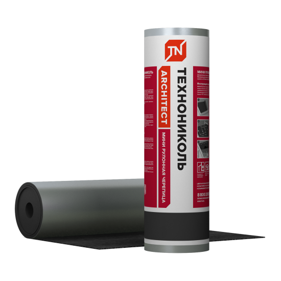 МИНИ Рулонную черепицу ТЕХНОНИКОЛЬ получают путем пропитки основы из стеклохолста битумным вяжущим с добавлением СБС полимеров, с последующим нанесением на нижнюю сторону полотна самоклеящегося битумного слоя. Верхнее покрытие материала – цветной базальт, нижнее покрытие – силиконизированная съемная пленка.